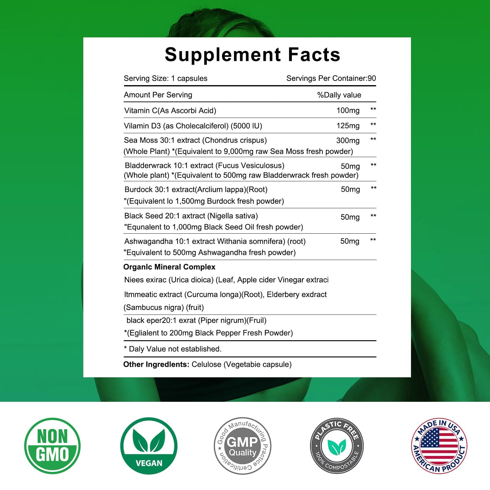 - ✅ Immune System: Most importantly, LANGIFT Irish SeaMoss capsules are rich in bladderwrack powder, burdock root, and Muira Puama, enhancing the supply of magnesium, vitamin A, vitamin K, and omega-3 fatty acids, improving the immune system and increasing your daily energy.